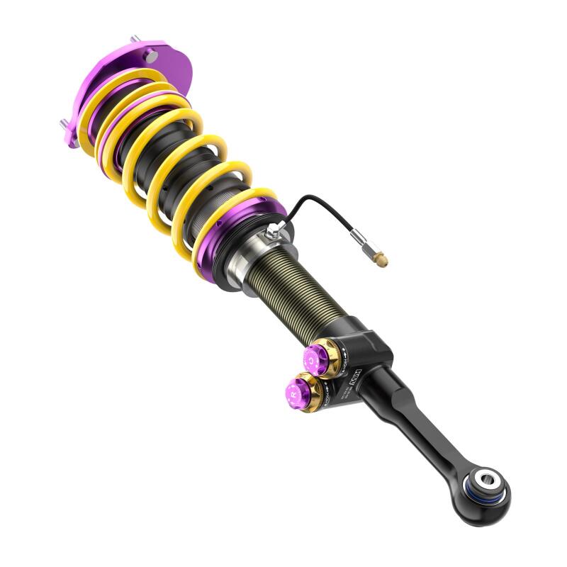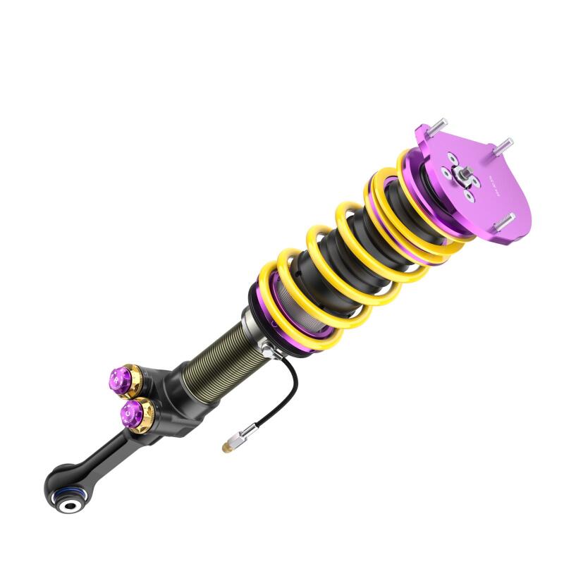 With the new KW V5 Clubsport coilover suspension, KW focuses on its successful motorsport suspension technology with KW Solid Piston Technology and modular design with damper valves connected in series. The KW V5 Clubsport assures precise and fast damping without delay. The shock absorbers and valves react directly, even with small spring travel, minimal steering movements, and minor road undulations. Every driving maneuver and input, such as those generated during braking, acceleration, steering, load changes, and undulations, are damped much more precisely. The KW Solid Piston dampers provide much more platform support to the chassis than conventional dampers and, depending on the vehicle allow for lower spring rates to be used. The KW V5 Clubsport with adjustable KW SPCLH-A (KW Solid Piston Compression Low- and Highspeed Adjustable) compression damping and KW SPRLH-A (KW Solid Piston Rebound Low- and Highspeed Adjustable) rebound damping offer significant added value: more sensitive damping, cavitation-free function, precise high-frequency damping, low-pressure gas range from 6 to 10 bar and low hysteresis. The valve units in the KW V5 Clubsport coilover suspension, which are built-in series with different valve spring types and main valves, offering the freedom to individually adjust the compression and rebound damping with 13 exact clicks (14 characteristic curves) each in the low- and high-speed range. The KW Solid Piston Technology can also be used to cover a large force range when designing the characteristic curves; all the more reason to enable a completely new type of harmonious damping. The KW V5 Clubsport coilovers feature our signature purple anodized KW Clubsport aluminum uniball solid top mounts for increased steering precision. Dial in a maximum or individual lowering within the tested adjustment range. Due to the dirt-resistant trapezoidal thread and the polyamide threaded ring, the continuous lowering can be adjusted quickly and easily.